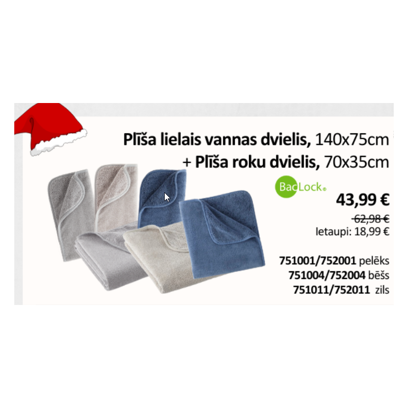 Decembrī, pērkot lielo plīša vannas dvieli, tādas pašas krāsas roku dvielis dāvanā. Krāsu varat izvēlēties un norādīt piezīmēs, noformējot pasūtījumu.
